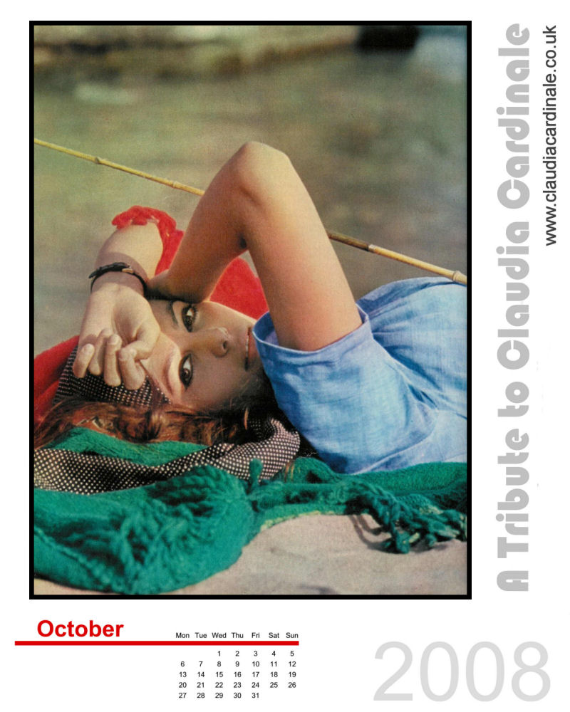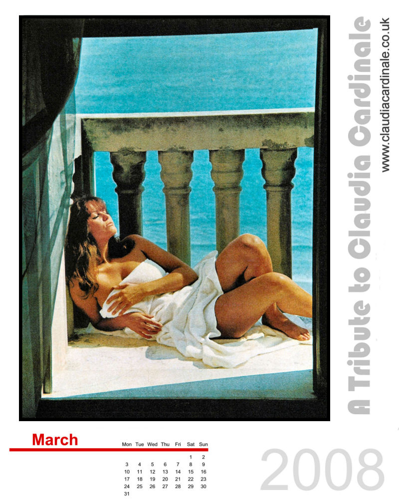 I have spent a great deal of time and money collecting images of Claudia Cardinale to share with you. Please do not use the images from this calendar (or elsewhere on this site) for anything other than personal use - I ask that you please do not publish content from this website elsewhere on the internet and strictly do not use images downloaded from this site for, or in anyway associated with, commercial gain. Please respect this request. "If it's on the internet, it's in the public domain" is nothing more than an urban myth, usually propagated by people trying to justify ripping you off. | |||||